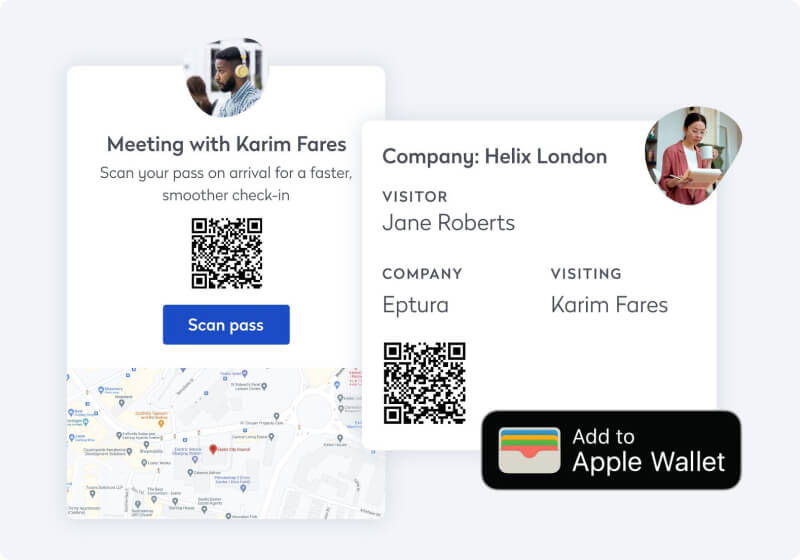 Eメール招待、電子署名NDA、RFIDアクセスカード、モバイルQRコードなどの統合により、タッチレス体験を提供し、入退室管理システムをスムーズに通過できるようにします。