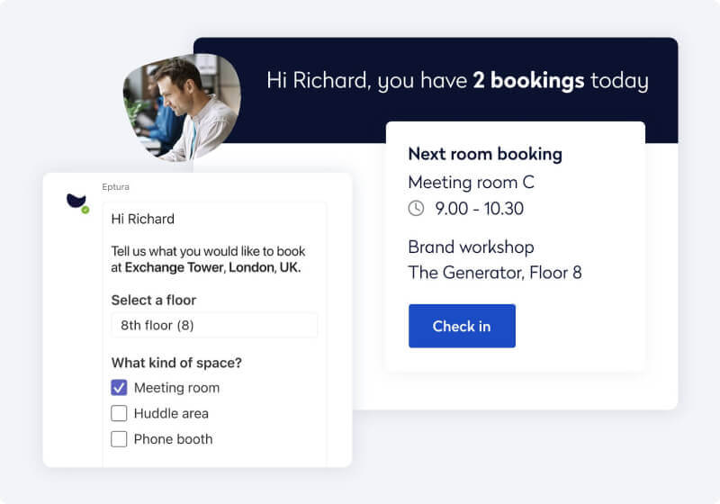 Workplace Experienceでは次の3つの機能を提供しています。これらの機能を日常的に利用することで、従業員は付帯工数を削減し、自分がすべき仕事に集中することで継続的な生産性向上が期待できます。また、よりよいワークプレイスの実現に向け、システムに自動収集されるデータを分析することで、データに裏付けされた施策立案が可能になります。