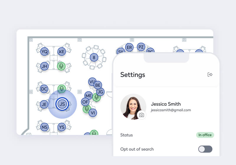 3Dリアルタイムフロアマップはオフィスでの業務効率を向上させる機能です。 チームメイトの出社状況や座席の場所をリアルタイムに可視化することで、職員同士のコミュニケーションが活性化され、生産性の向上が期待されます。 また、座席や会議室の利用状況が可視化されているので、突発的な打ち合わせや対面での作業の際、すぐに利用可能な場所を見つけることができます。このような環境は、生産性やチームワークを向上させると同時に職員のストレスを軽減させるため、結果として従業員満足度の向上が期待できます。