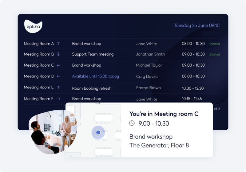 デジタルキオスクを会議室エリアに設置することで、即時予約と利用延長を可能にします。通りがかりに予約でき、また会議中の時間延長も簡単にできるため、「延長し忘れ」を防ぎます。