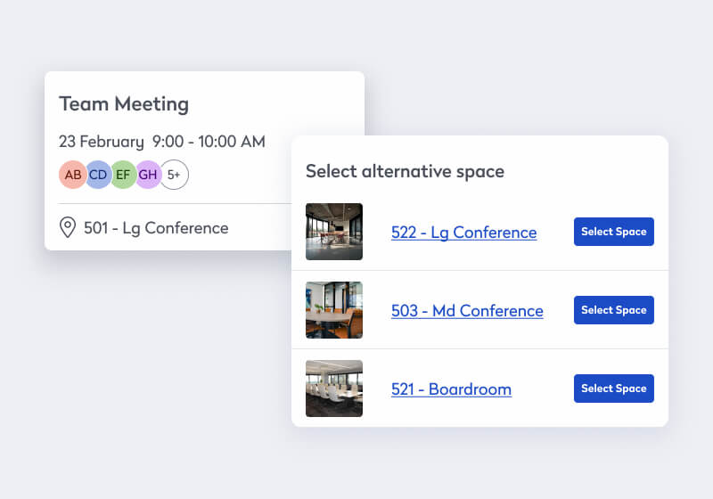 定期的に行われる会議については、システムが自動的に会議室を確保します。希望の会議室がすでに予約済みの場合、代替となる会議室を提案することで、確実に会議が行えるようにします。
